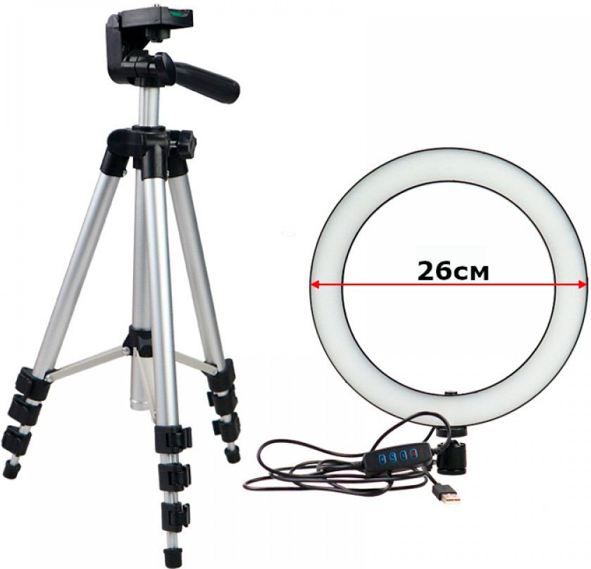 Комплектация | Светодиодная лампа со штативной головкой • штатив • крепление на трубу • гибкая ножка с держателями для телефона |