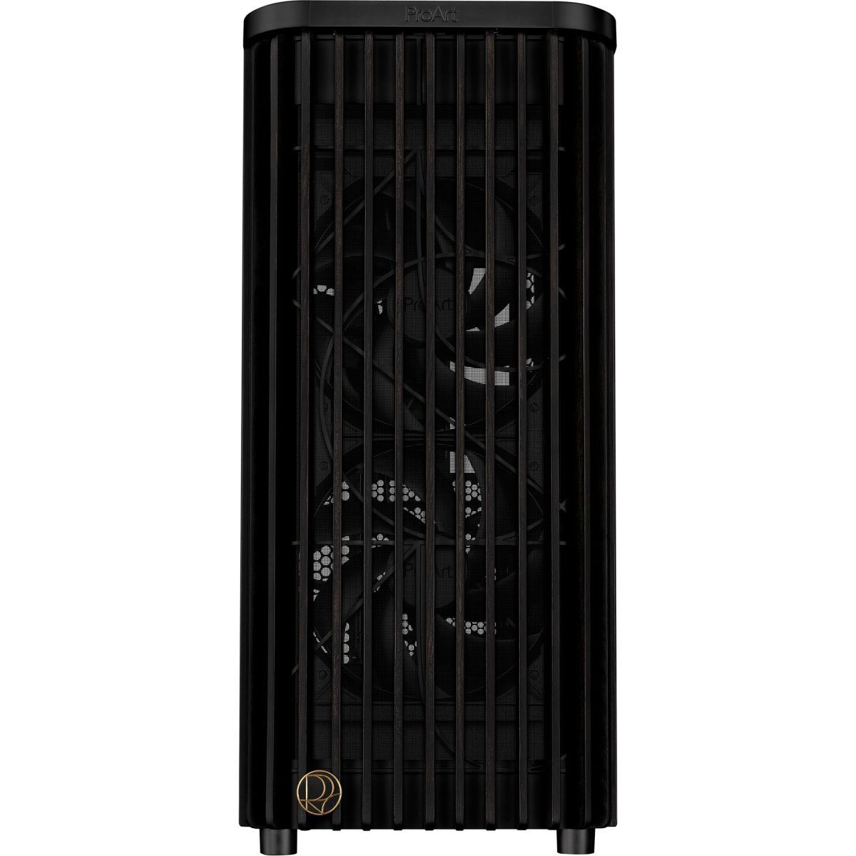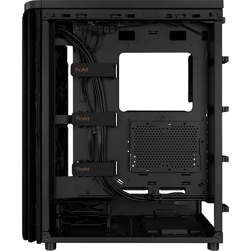 Корпус ASUS ProArt PA401 Wood Edition выделяется передней панелью из натурального ясеня, обработанного по шестиступенчатой технологии для элегантного внешнего вида и долговечности. Материал сертифицирован FSC, что подчёркивает экологическую ответственность. Встроенное охлаждение включает два 160 мм фронтальных и один 120 мм задний вентилятор для эффективной вентиляции.
