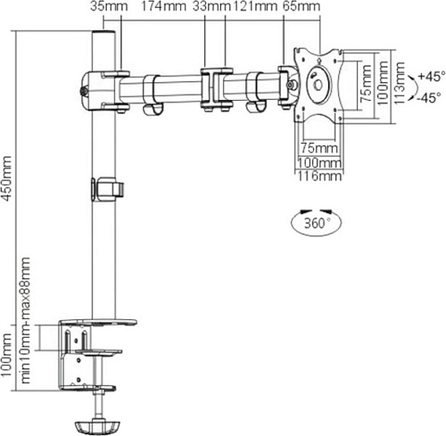 Кронштейн поддерживает диагональ телевизора от 13 до 27 дюймов и имеет тип крепления VESA 100x100 и VESA 75x75, что делает его совместимым с большинством телевизоров. Он обладает поворотной, наклонной и регулировочной конструкцией по высоте, позволяющей поднимать угол обзора. Угол поворота составляет 180°, угол наклона - от -45° до +45°, что позволяет настроить его под любой сценарий использования. Также кронштейн обеспечивает вращение на 360°, что обеспечивает гибкость.