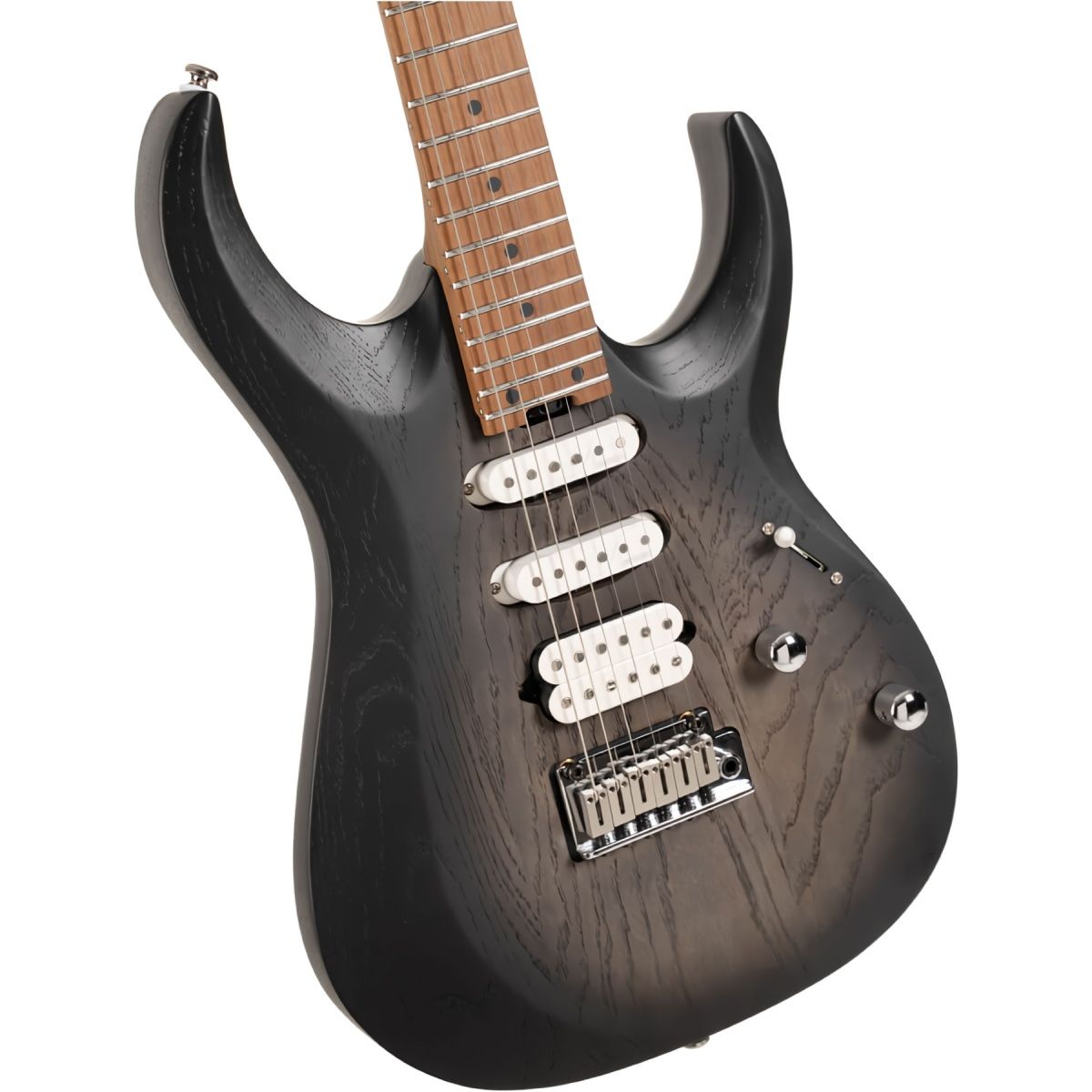 Накладка с грифом выполнены из термообработанного (roasted) клена, прошедшего специальную бескислородную обработку. Это повышает стабильность древесины, улучшает резонансные характеристики и придает премиальный внешний инструмент с золотисто-коричневым оттенком. Кроме того, roasted клен дарит гитаре более плотный и сфокусированный тембр.