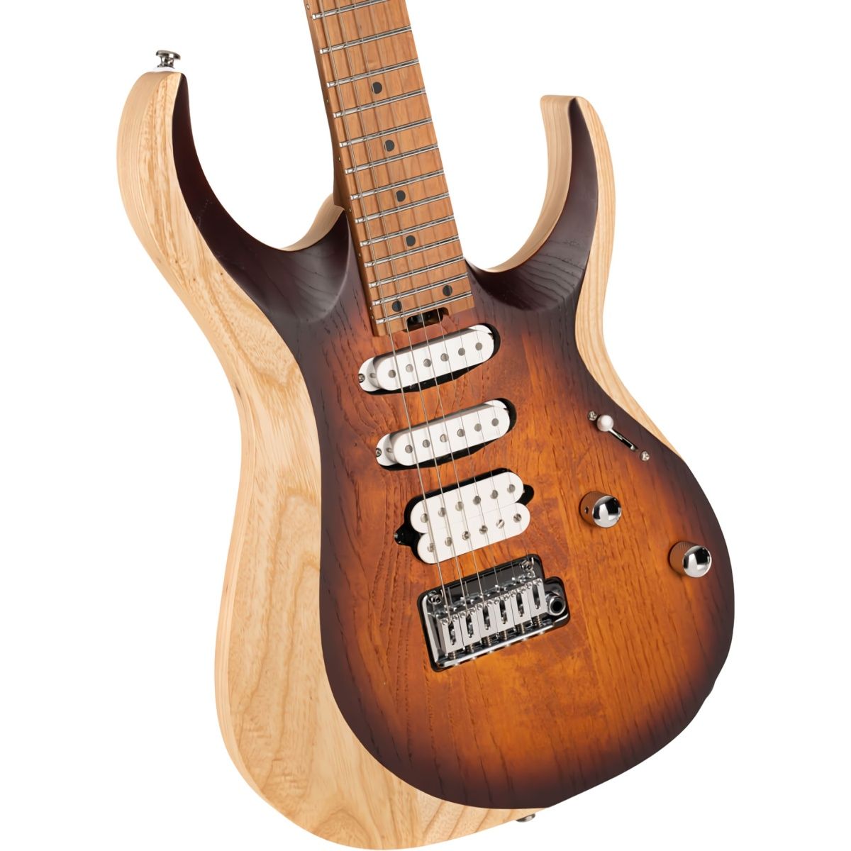 Накладка с грифом выполнены из термообработанного (roasted) клена, прошедшего специальную бескислородную обработку. Это повышает стабильность древесины, улучшает резонансные характеристики и придает премиальный внешний инструмент с золотисто-коричневым оттенком. Кроме того, roasted клен дарит гитаре более плотный и сфокусированный тембр.