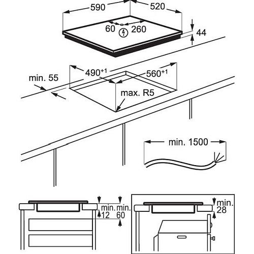 Размеры | 590 х 520 х 50 мм (варочная поверхность) • 560 х 490 х 44 мм (монтажные размеры) |
