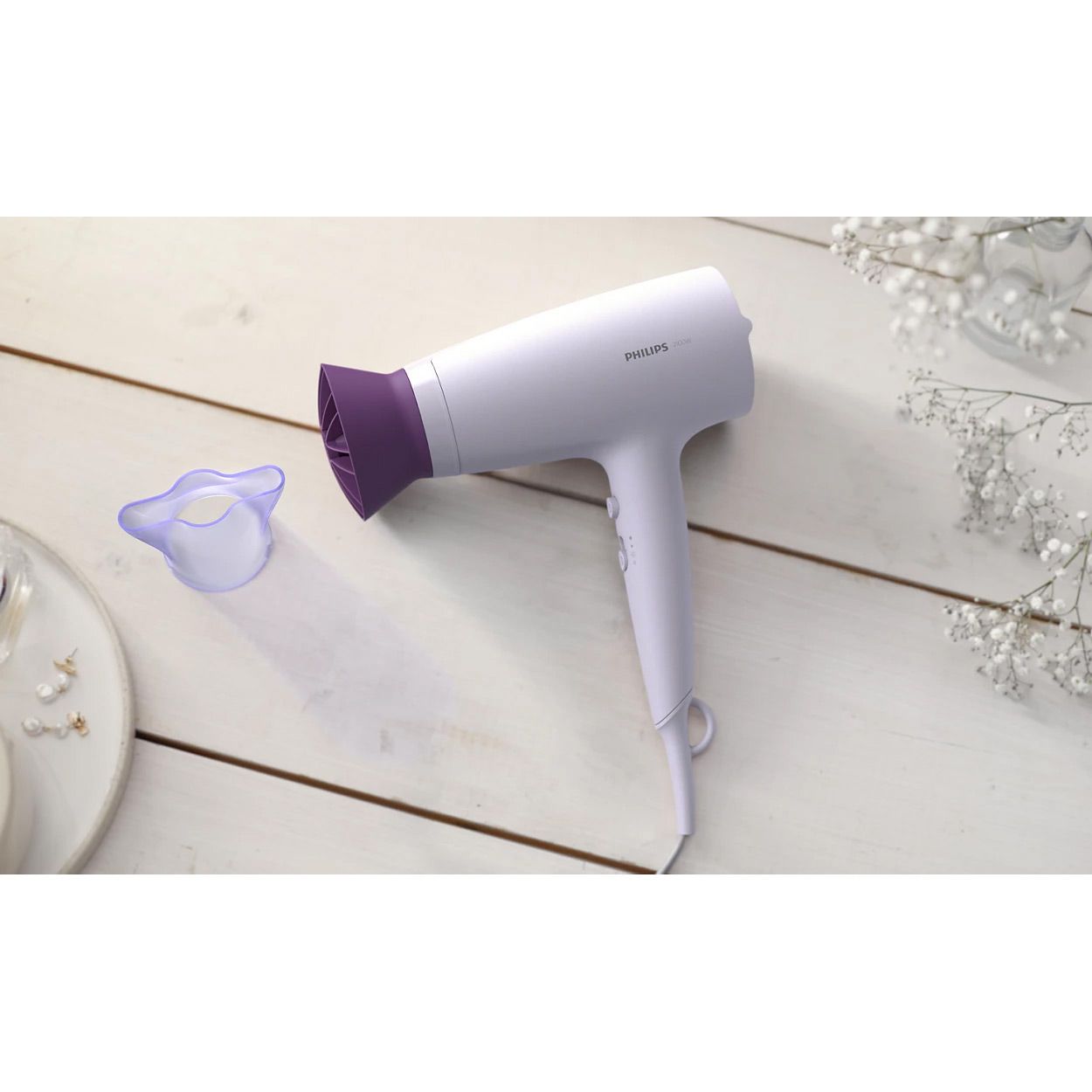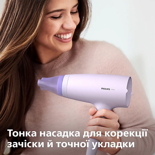 В комплекте с Philips BHD341/10 предусмотрена узкая насадка-концентратор, фокусирующая поток воздуха с высокой точностью. Она позволяет быстро скорректировать отдельные пряди или придать завершенность прическе, не нарушая общий объем. Такой подход особенно удобен при формировании мелких деталей — челки, кончиков или контуров, обеспечивая профессиональный результат в домашних условиях.