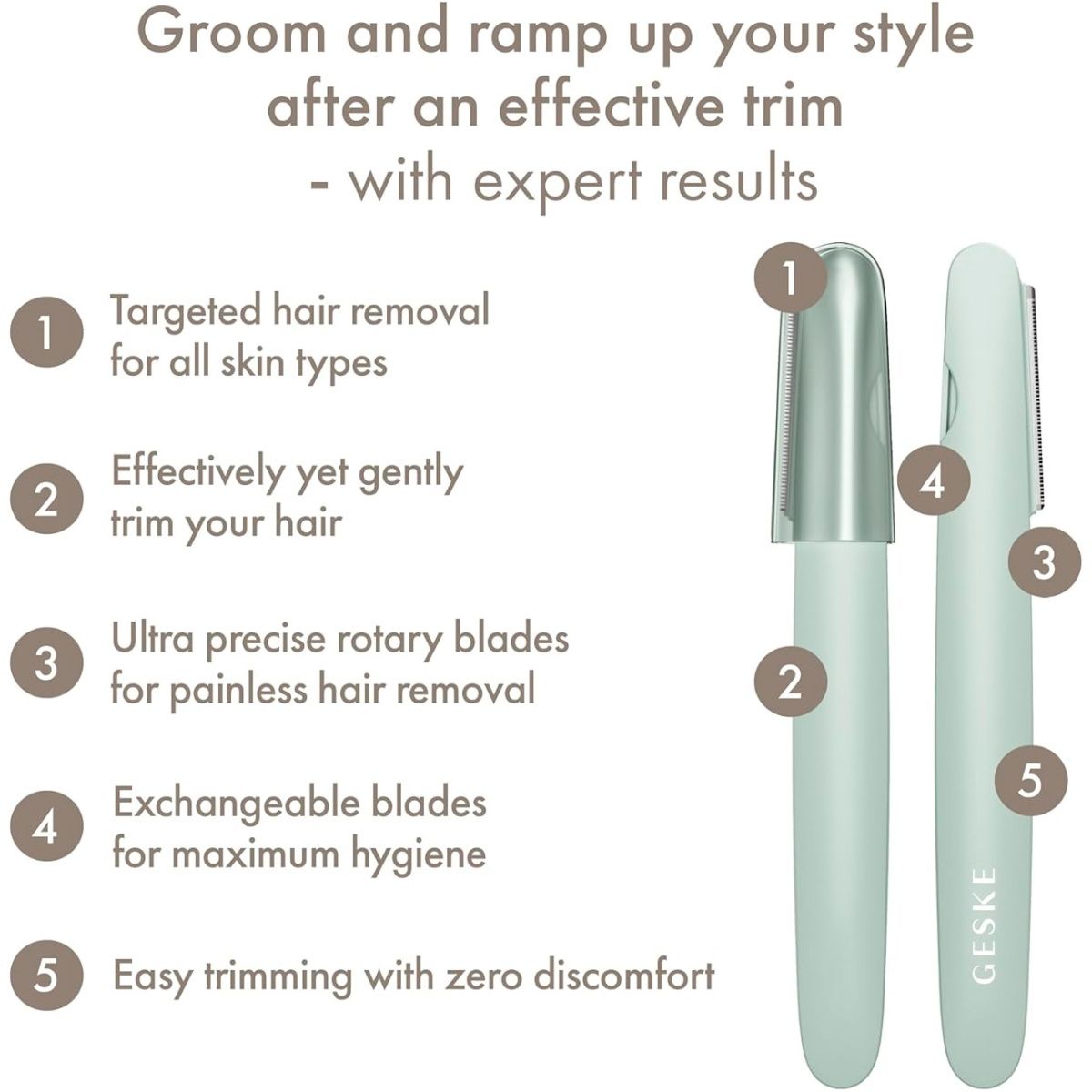 GESKE Precision Trimmer 4in1 не только эффективно удаляет нежелательные волосы, но и способствует общему улучшению состояния кожи. Использование триммера в сочетании с рекомендованными средствами ухода помогает достичь гладкой, мягкой и здоровой кожи. Это делает триммер идеальным выбором для тех, кто стремится к комплексному и персонализированному уходу за собой. Система сменных лезвий позволяет легко поддерживать триммер в чистоте, обеспечивая гигиеничность каждой процедуры. Экологически чистые материалы, из которых изготовлены лезвия, способствуют сохранению окружающей среды. Благодаря этому триммер является не только эффективным, но и ответственным выбором для современного пользователя.
