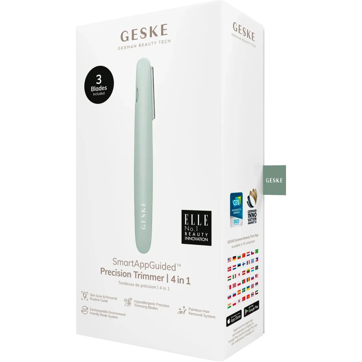 Гипоаллергенные микроточные лезвия для контуринга Hypoallergenic Precision Trimming Blades гарантируют нежное прикосновение без раздражений даже для самых чувствительных участков. А благодаря инновационной системе Painless Hair Removal System, процесс удаления волос становится абсолютно безболезненным. Для поддержания высочайшего уровня гигиены предусмотрена экологичная система Exchangeable Environment-friendly Blade System, которая позволяет быстро и легко заменять лезвия без вреда для окружающей среды. Передовая система Skin Scan & Personal Routine Guide, которая работает на основе искусственного интеллекта, при помощи приложения на вашем смартфоне, анализирует состояние кожи и предлагает персонализированные рекомендации, чтобы пользователь получал максимальную эффективность от каждого сеанса. Все это делает триммер GESKE не просто эффективным, а чрезвычайно умным инструментом для красоты.