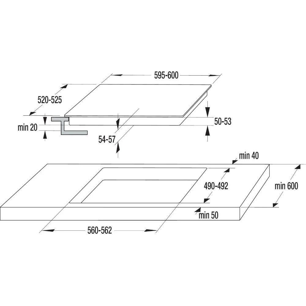 | Размеры | 595 х 520 х 54 мм (варочная поверхность) • 560 х 490 х 70 мм (монтажные размеры) |