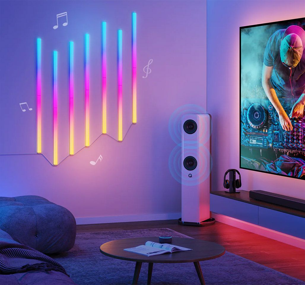 Светодиодные панели могут синхронизироваться с музыкой и звуками, создавая динамическую атмосферу и подчеркивая ритмы и настроение. Вы также можете управлять подсветкой с помощью голосового управления через Google Assistant и Alexa. Беспроводное управление яркостью позволяет вам легко настроить освещение без необходимости подходить к светильнику.