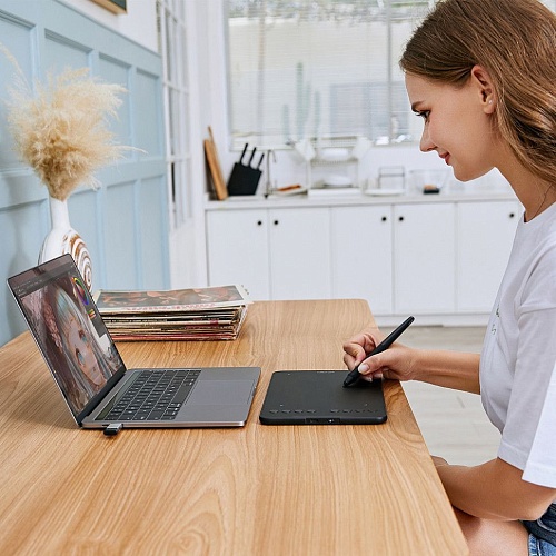В комплекте используется пассивный стилус P05D, который не требует батареек или подзарядки. Это обеспечивает непрерывную работу без технических перерывов и упрощает эксплуатацию устройства. Стилус поддерживает наклон до 60 градусов, что позволяет точно передавать тени, плавные переходы и объем, делая цифровое рисование более естественным и реалистичным.