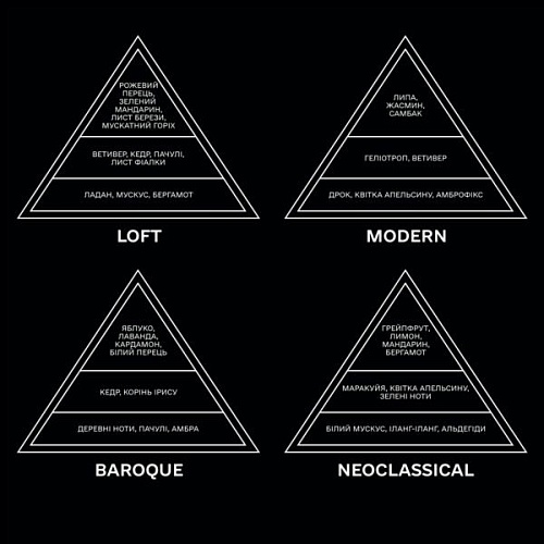 | Аромат | Свежий, Цветочный, Цитрусовый, Фруктовый, Древесный, Мускусный, Восточный, Ореховый |
