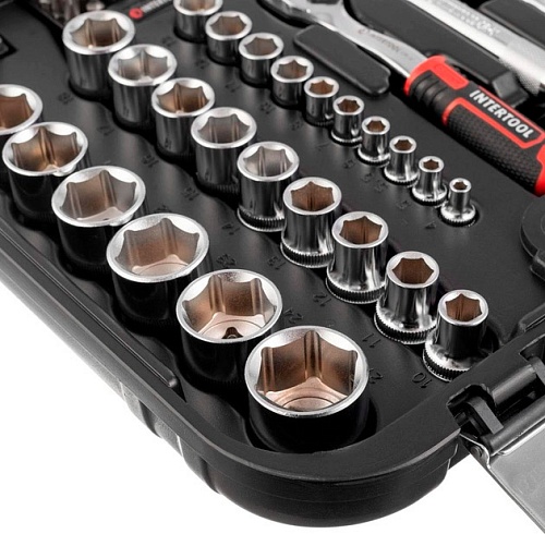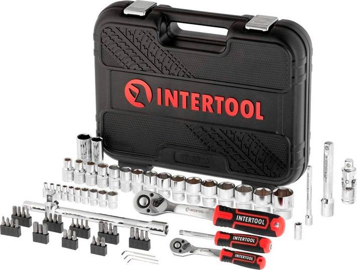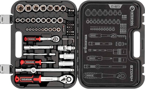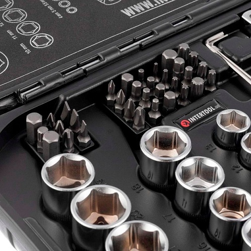 Главная особенность набора в его комплектации. Здесь собраны все необходимые инструменты для замены свечей зажигания, тормозов и любой другой сложной детали автомобиля, расположенной в самых недоступных местах. В комплекте вороток, удлинители, головки и кардан, нужны для откручивания гаек, болтов и шпилек в глубоких колодцах двигателей или в местах, где сложно их достать. Две головки для снятия свечей зажигания (21 и 16 мм), позволяют заменить свечи на автомобиле любого производителя, включая и страны ЕС. Разнообразные биты (SL, PZ, PH, M, TORX, HEX) пригодятся для работы с различными видами шлицов, которые используют в мебельной промышленности, строительстве, машиностроении и пр.