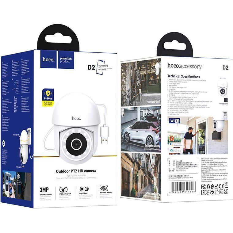 IP-камера Hoco D2 создана для наружного наблюдения и сочетает в себе передовые возможности изображения с широким углом обзора. Оснащенная 3-мегапиксельным CMOS-сенсором SC2336 размером 1/3 дюйма, она передает видео в разрешении 1296p (2304х1296 пикселей), обеспечивая детализированную картинку в реальном времени. Объектив 1G3P с диафрагмой F1.6 и фокусным расстоянием 4 мм в сочетании с углом обзора 100° позволяет видеть больше пространства и уменьшает риск появления «слепых зон». Панорамный охват достигается благодаря горизонтальному повороту на 350° и вертикальному наклону на 96°, что делает устройство универсальным для контроля больших территорий. Технология сжатия H.265 оптимизирует поток, сохраняя высокое качество изображения при низком битрейте, что позволяет экономить трафик и память без потери четкости.