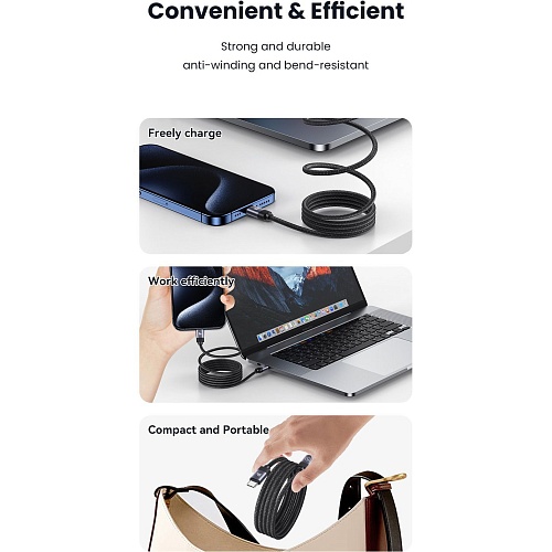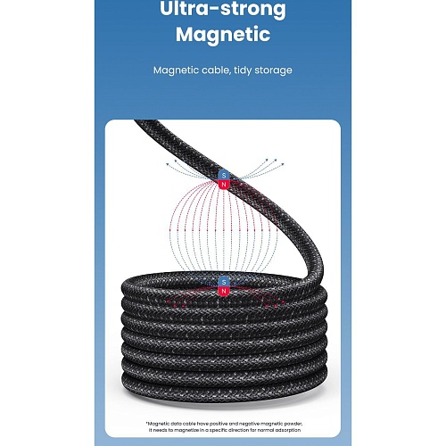 Кабель оснащен встроенными магнитными элементами с положительной и отрицательной полярностью, благодаря которым он самостоятельно фиксируется в скрученном состоянии. Это позволяет аккуратно сматывать кабель без использования дополнительных фиксаторов, предотвращает запутывание и упрощает хранение в сумке или на рабочем столе. Магнитная структура работает в определенном направлении, обеспечивая надежное притяжение витков между собой и поддерживая аккуратный вид кабеля при ежедневном использовании.