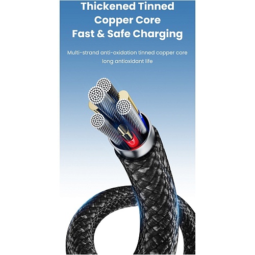 Кабель оснащен высокоплотной нейлоновой оплеткой с двойным плетением, которая эффективно защищает его от растяжения, изломов и перекручивания при ежедневном использовании. Такая конструкция повышает износостойкость и обеспечивает стабильную форму кабеля даже при частых изгибах. Внутри используется утолщенная многожильная луженая медная жила с антикоррозионными свойствами, что гарантирует быструю и безопасную передачу тока, минимальные потери энергии и длительный срок службы без окисления.