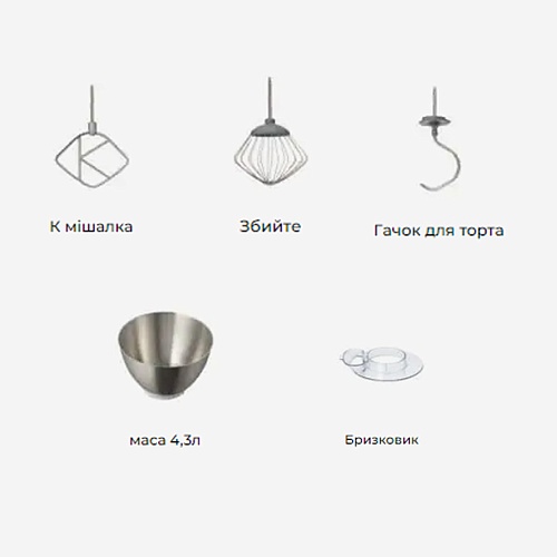 Насадки в комплекте | К-образная насадка , Венчик , Крюк для теста |