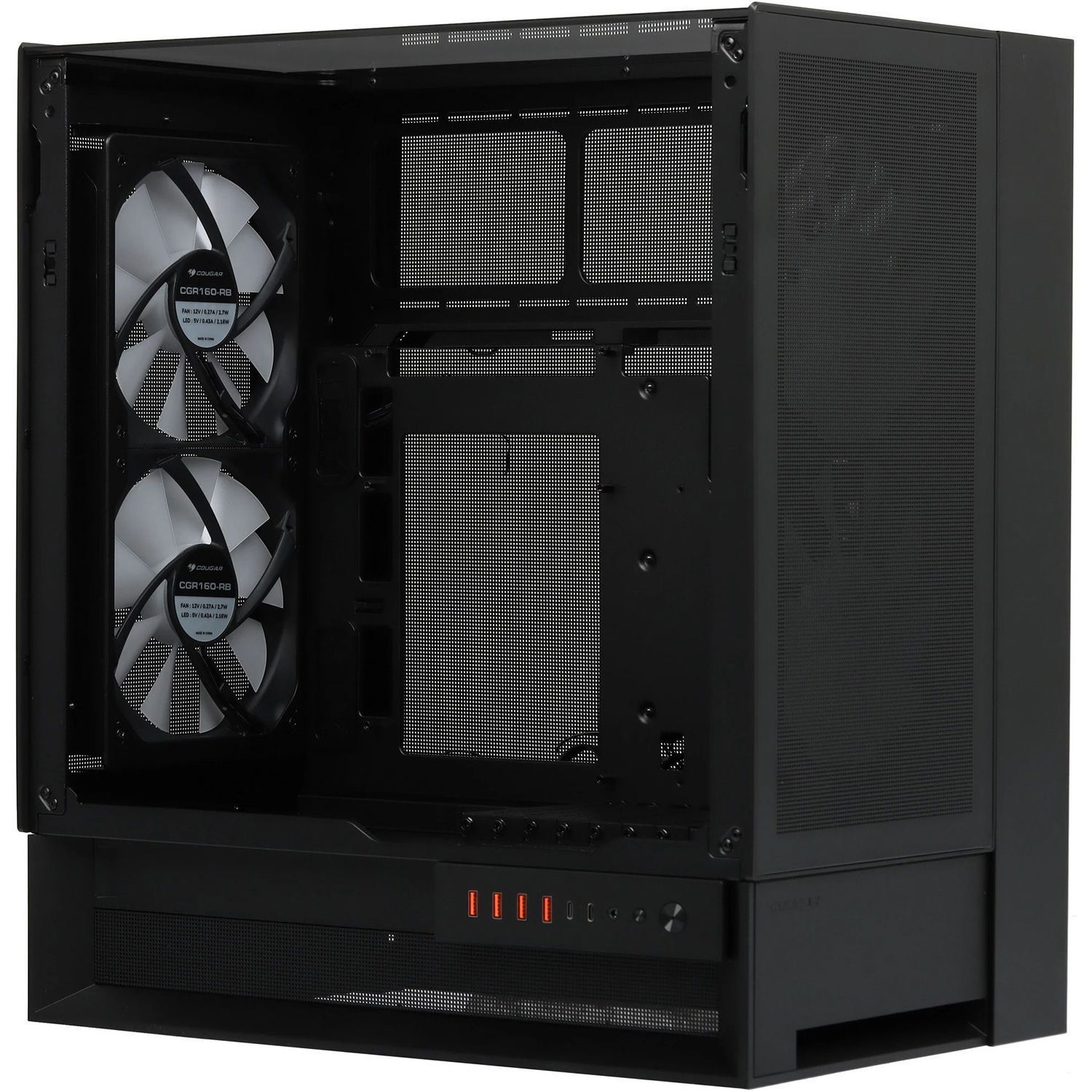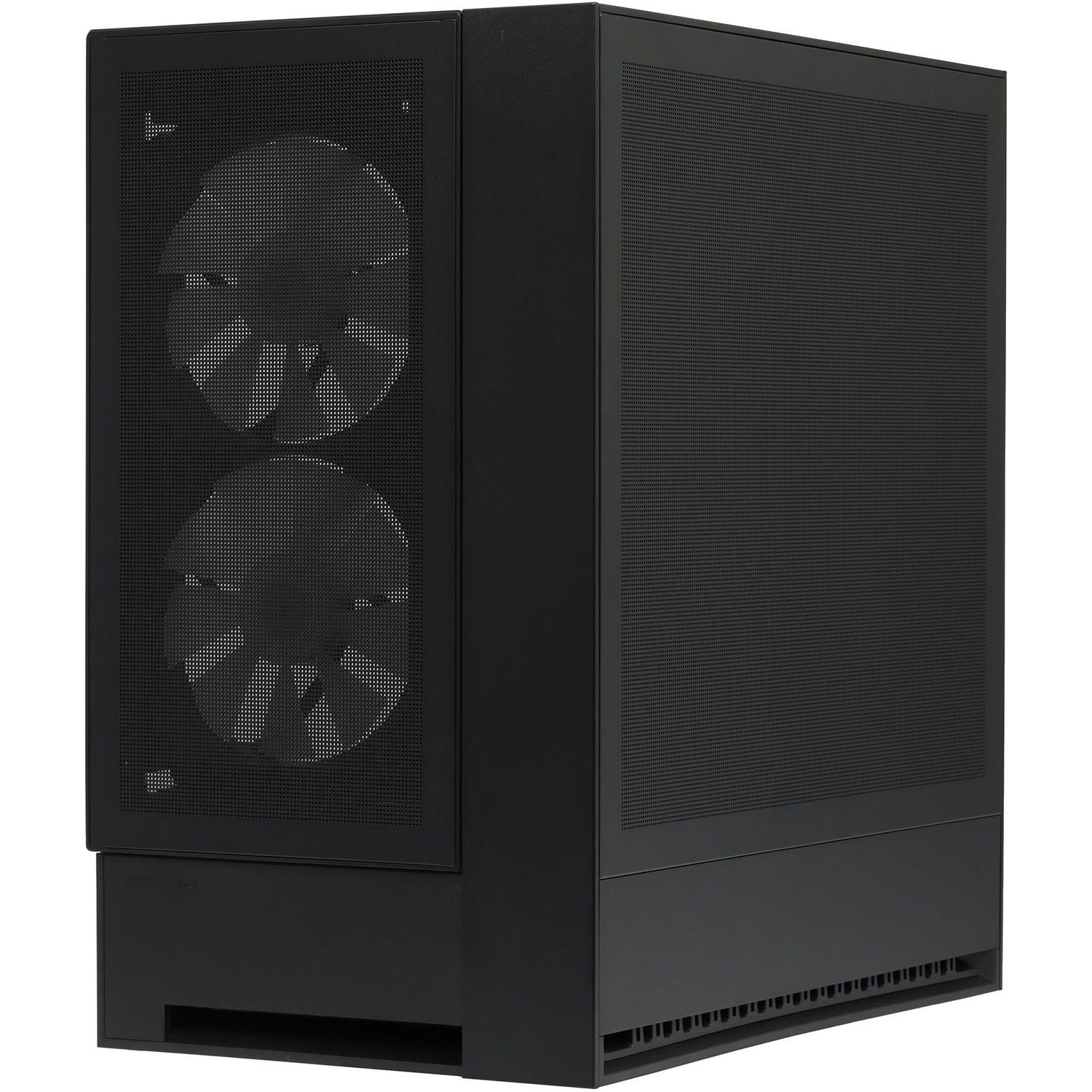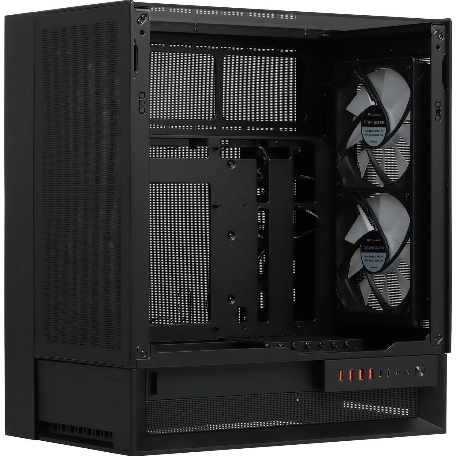 Корпус оснащён четырьмя крупными 160-мм вентиляторами с PWM-управлением, формирующими мощный воздушный поток сразу после распаковки. Их зеркальная компоновка создаёт направленный «струйный» поток: фронтальные вентиляторы подают холодный воздух, а задние выводят нагретый по прямой траектории. Поддержка до семи вентиляторов и грамотное распределение лопастей различной геометрии обеспечивают гибкость настройки воздушного баланса при любой ориентации корпуса.