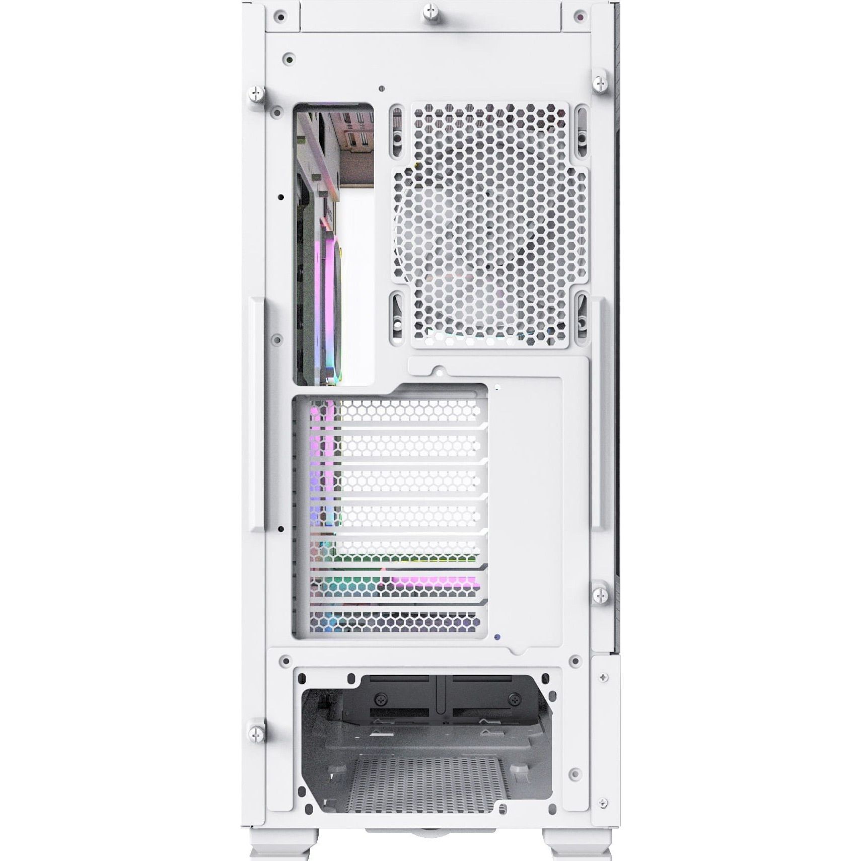 В комплекте предусмотрены четыре вентилятора ARGB PWM, которые не только обеспечивают эффективное охлаждение, но и создают стильный вид системы. Три RX120 с перевернутыми лопастями расположены сбоку и на кожухе блока питания для оптимального забора воздуха. Еще один AX120 установлен на задней панели, отвечая за вывод нагретого воздуха. Благодаря продуманным отверстиям и инновационному расположению вентиляторов система охлаждения работает максимально эффективно, поддерживая стабильную работу даже при высоких нагрузках.
