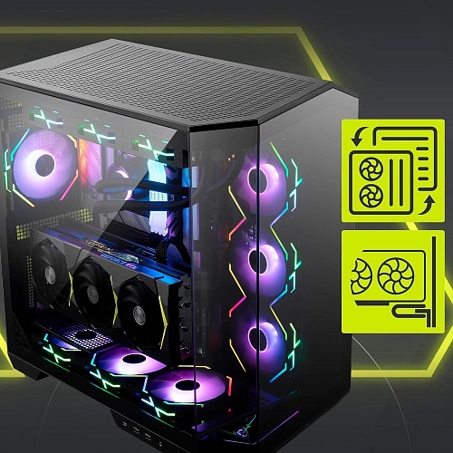 Двухкамерная архитектура корпуса предусматривает просторный отсек для укладки кабелей, что существенно снижает сложность маршрутизации и упрощает организацию внутреннего пространства. Достаточный запас места позволяет аккуратно разместить проводку, улучшить воздушный поток и обеспечить чистый, аккуратный вид системы без лишнего беспорядка.