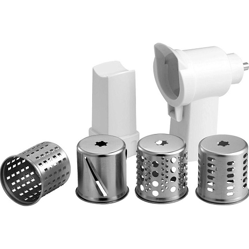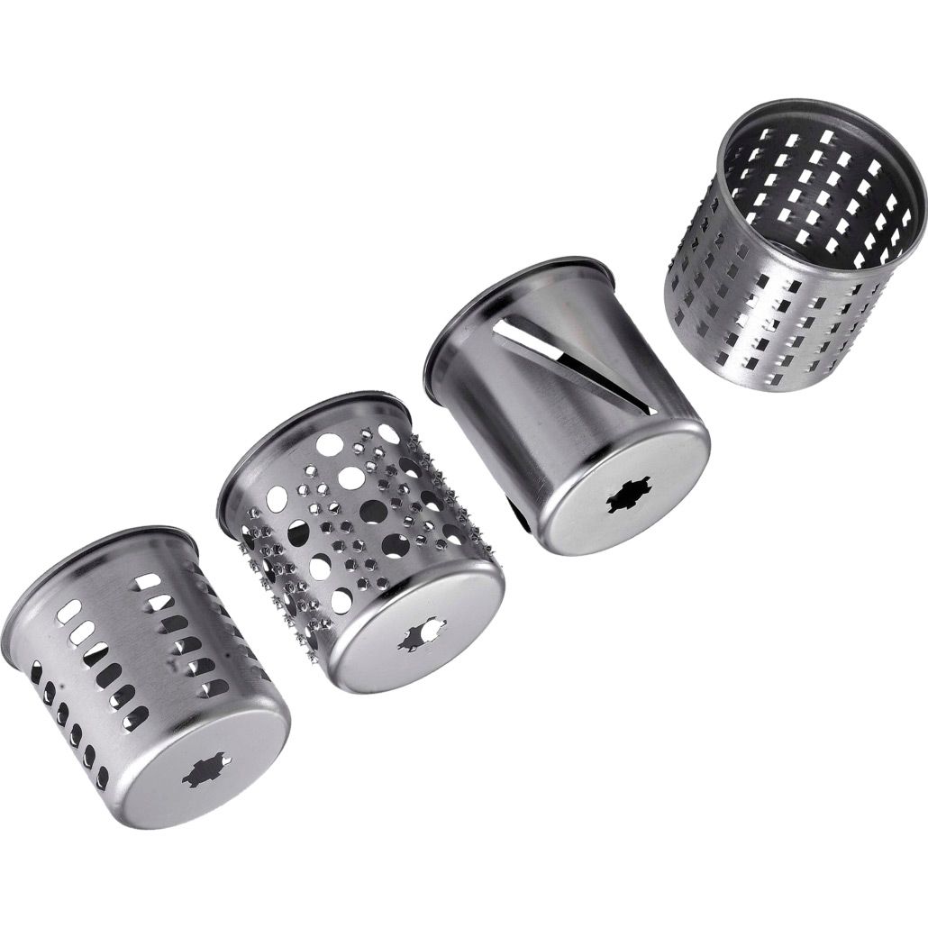 Комплектация | Мясорубка • формовочные диски для измельчения и рубки 3 шт. • барабаны для терки и шинковки 4 шт. • насадка для колбасок • насадка «кеббе» • шнековая соковыжималка • толкатель • документация |