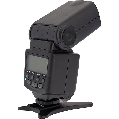 Вспышка имеет большой угол обзора, позволяющий осуществлять качественную съемку как в студии, так и на улице с большим захватом в кадр. В комплекте поставляется специальная подставка, что позволяет установить вспышку как на камеру, так и на любую горизонтальную поверхность. Удобный батарейный отсек обеспечивает быструю замену элементов питания в любых условиях.