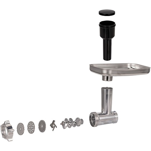 Комплектация | Кухонная машина • основная чаша • чаша блендера с блоком ножей • крюк для теста • насадка для смешивания • венчик • защитная крышка • мясорубка (корпус головки • шнек • лезвие • диски 3шт - 3мм, 5мм, 7мм • фиксирующее кольцо • лоток для продуктов • толкучка) • лопатка • документация |