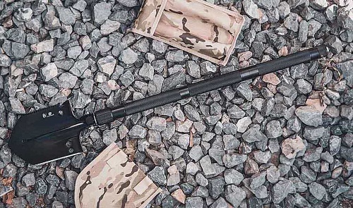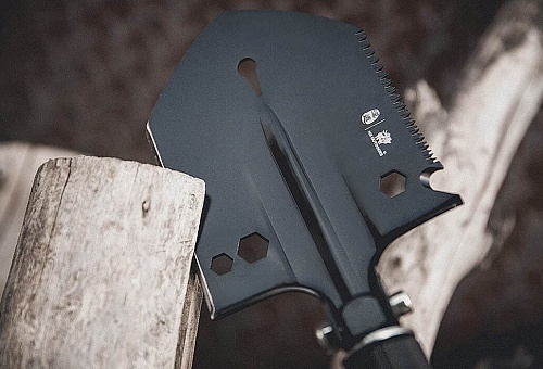 Лопата оснащена встроенным компасом, рукояткой со стеклобойником, свистком со штифтом для разведения огня, отверткой, ножом, открывашкой, шестигранником и небольшой пилой.