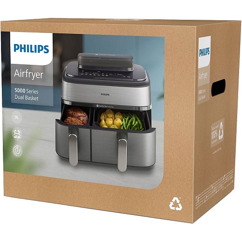 Мультипечь Philips Dual Basket Airfryer 5000 Series NA555/00 обеспечивает приготовление вкусных блюд с до 90% меньшим количеством жира, используя технологию RapidAir Plus. Уникальная конструкция в виде звезды позволяет горячему воздуху циркулировать вокруг и через еду, обеспечивая равномерное приготовление. Вы получите отличную хрустящую корочку снаружи и нежную текстуру внутри, даже без добавления масла.