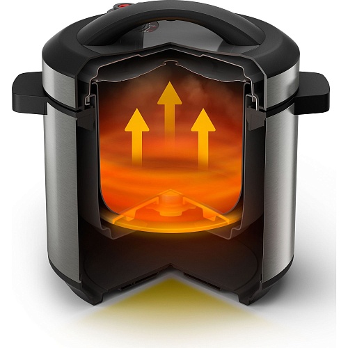 Эта мультиварка-скороварка позволяет готовить пищу с минимальным количеством жира благодаря режиму "Горячий воздух", который обеспечивает хрустящую корочку без излишков масла. Высокая мощность устройства позволяет быстро разогревать и готовить блюда, экономя ваше время. Дополнительно функция автоматического подогрева поддерживает оптимальную температуру блюд до подачи на стол.