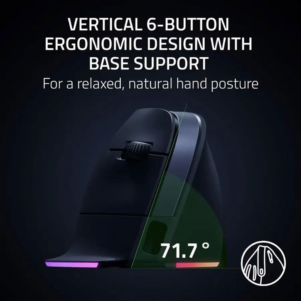 Мышь Razer Pro Click V2 Vertical Edition создана для тех, кто проводит много времени за компьютером и стремится уменьшить нагрузку на кисть и предплечье. Вертикальная конструкция с углом наклона примерно 71,7° формирует естественное положение руки, похожее на рукопожатие, что помогает снизить напряжение и дискомфорт во время длительной работы. Такой подход позволяет поддерживать более правильное положение запястья и уменьшает усталость даже после многочасовых рабочих сессий. Продуманная форма с опорой для большого пальца и расширенной основой обеспечивает стабильный хват, благодаря чему движения остаются точными и контролируемыми независимо от стиля использования.