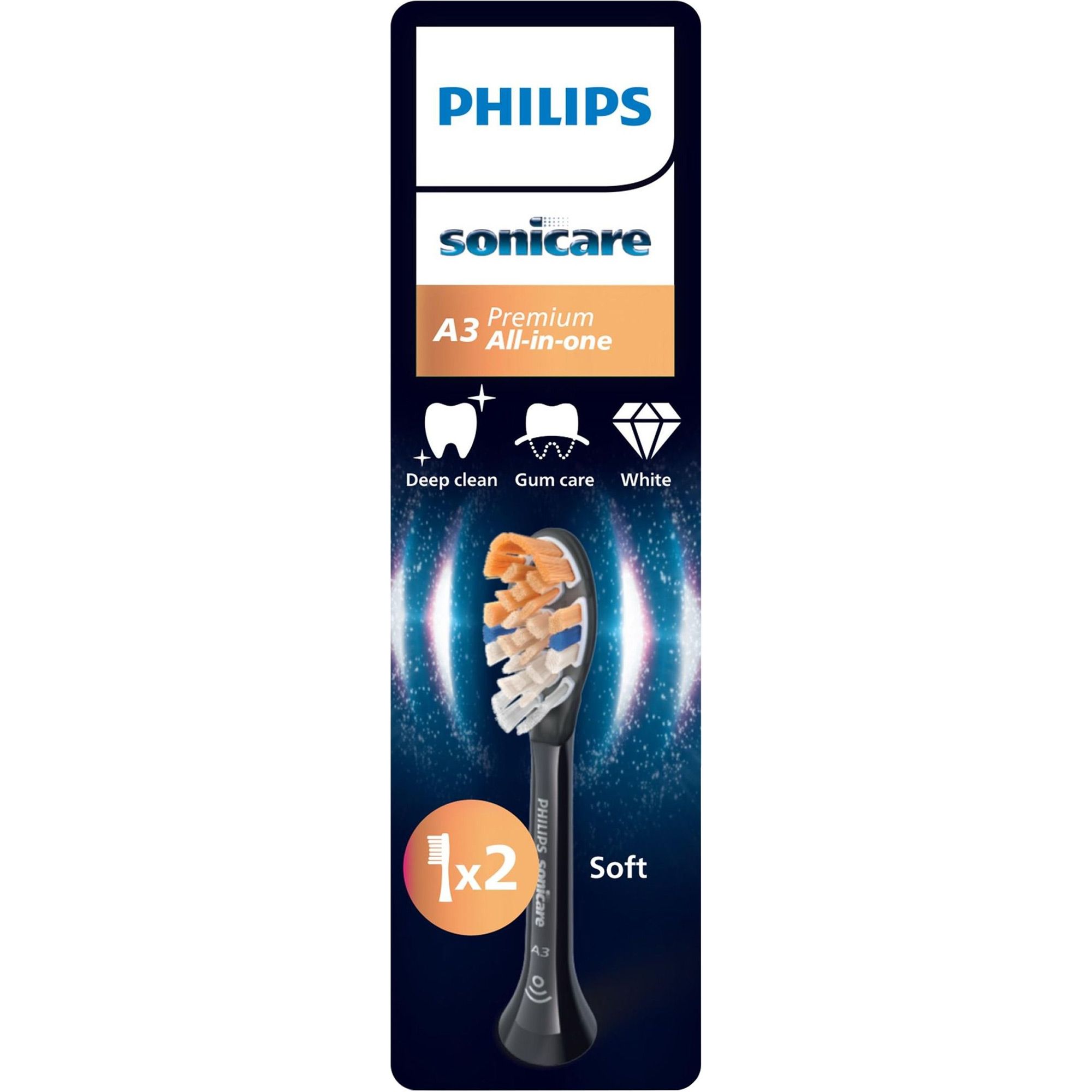 Насадка Philips Sonicare A3 Premium All-in-One сочетает в себе три ключевых преимущества — эффективное удаление налета, борьбу с пятнами и поддержание здоровья десен. Благодаря технологии Sonicare зубные щетки выполняют до 62 000 движений щетинок в минуту, создавая динамический поток жидкости, который достигает промежутков между зубами и линии десны. Это обеспечивает ощущение профессиональной чистоты даже дома. Насадка легко устанавливается и снимается, совместима со всеми съемными ручками Philips Sonicare, что делает ее универсальным решением для ежедневного использования.