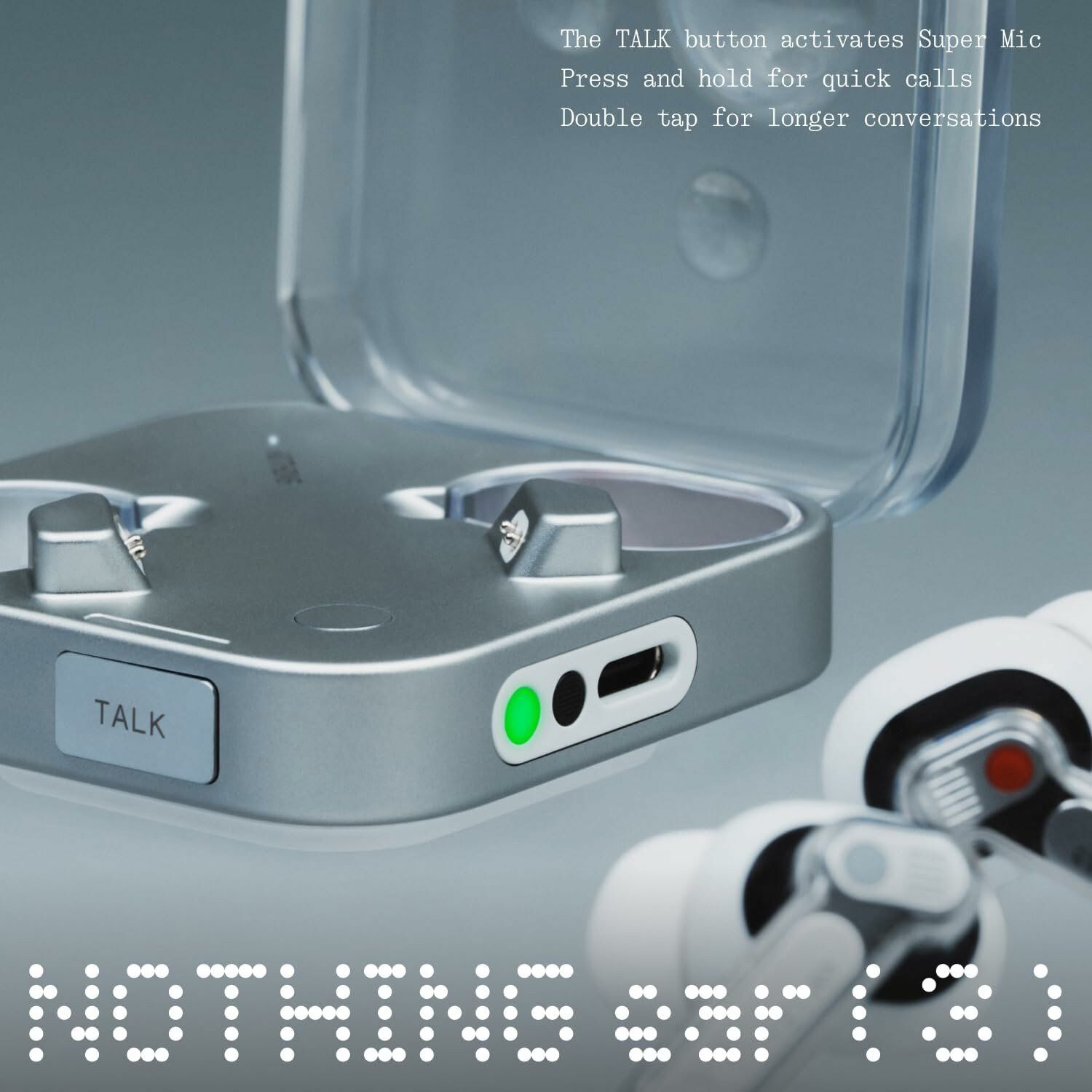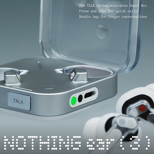 В зарядном кейсе Ear (3) встроена инновационная система из двух микрофонов с пространственной фильтрацией шумов, известная как Super Mic. Она специально сфокусирована на передаче вашего голоса и эффективно отсекает окружающие шумы громкостью до 95 дБ, обеспечивая исключительную чистоту во время звонков и голосовых заметок. Для активации режима достаточно нажать кнопку TALK на кейсе и продолжать разговор без перерывов, независимо от обстановки. Внутри кейса работают два высокоточных MEMS-микрофона с технологией beamforming, которые адаптируются к окружению, точно определяют направление голоса и гарантируют стабильное качество связи даже в шумном городе, транспорте или многолюдном помещении.
