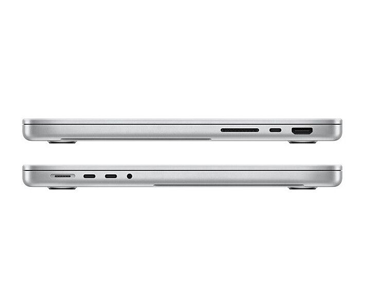 Слот для карт SDXC позволяет переносить фото и видео. Порт HDMI — подключать телевизоры и мониторы. Выход 3.5 мм автоматически распознаёт наушники с высоким импедансом и коррек­тирует параметры. Три порта Thunderbolt 4 служат для подклю­чения высокоскоростных периферийных устройств. А к разъёму питания MagSafe 3 легко примагнитить кабель для быстрой зарядки.
