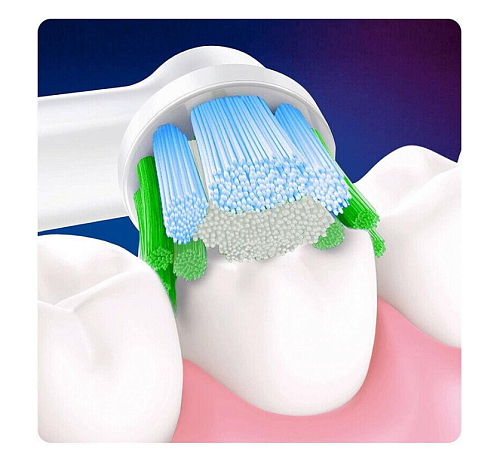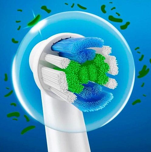 Интердентальные щетинки, голубого цвета, слегка выступающие над другими пучками щетинок. Это специально разработано для максимального проникновения в межзубные промежутки. Они прекрасно справляются с вычисткой зубного налета и остатками застрявшей пищи. Щетинки насадки легко очищают любое место полости рта. При намокке щетинки становятся мягче, а это способствует аккуратному очищению полости рта. Щетинки голубого цвета позволяют счистить находящуюся между зубами грязь. Насадку можно использовать вместе с щетками: Oral-B Professional Care, Oral-B Advance Power, Oral-B Triumph, Oral-B Vitality. Исключение составляют Sonic Complete и Cross Action Power.
