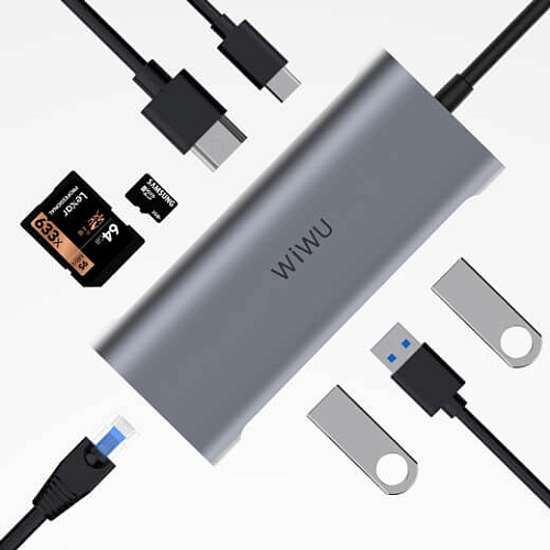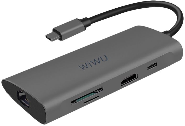 Все функциональные возможности хаба WIWU Alpha 8-in-1 помещены в совершенно негабаритный и легкий корпус, который можно переносить в рюкзаке или чехле-сумке от ноутбука. Основание корпуса выполнено из качественного алюминиевого сплава, за счет чего, аксессуар устойчив к механическим повреждениям поверхности. Разъемы хаба распложены таким образом, чтобы не перекрывать доступ к одновременному подключению сразу нескольких периферийных устройств.