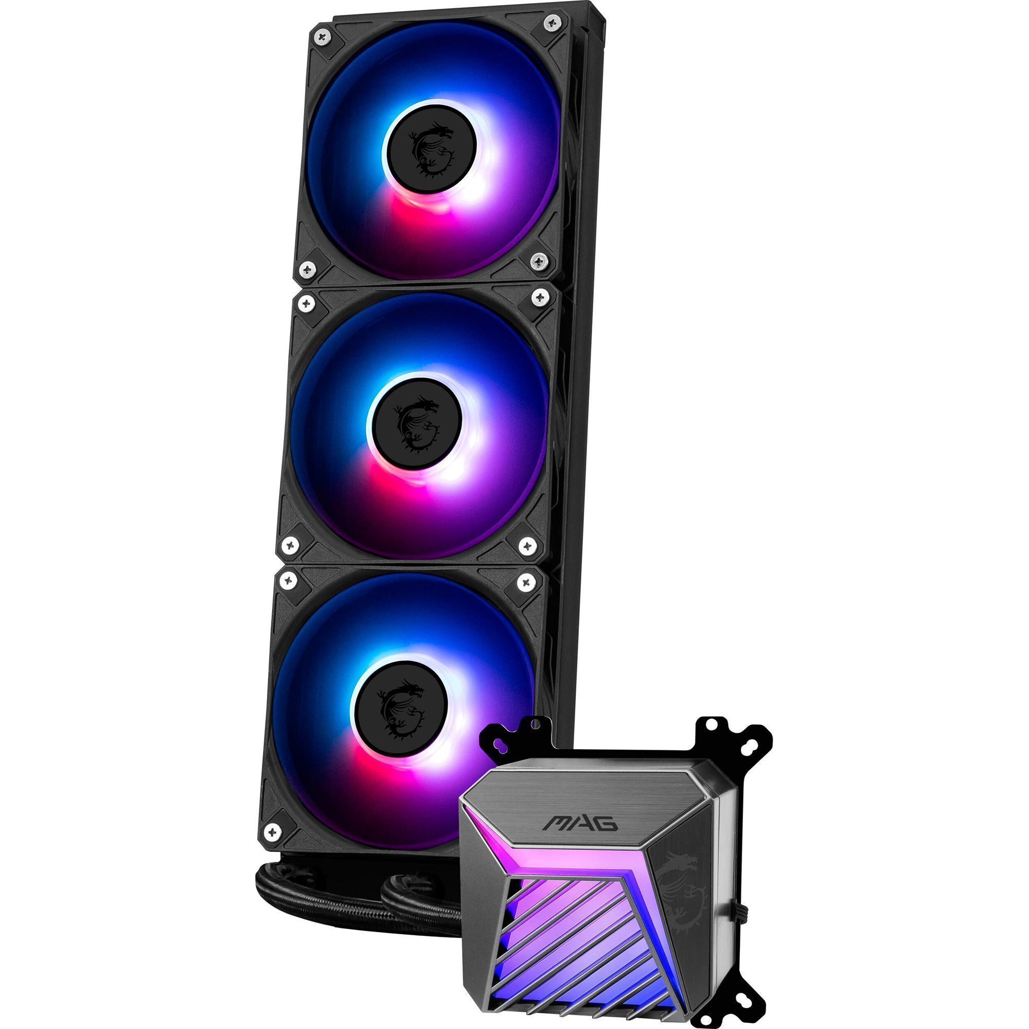 Водяные трубки изготовлены из EPDM и дополнительно защищены нейлоновой оплеткой. Такая конструкция обеспечивает устойчивость к температурным перепадам, коррозии и испарению охлаждающей жидкости, а также сохраняет гибкость при монтаже. Управление скоростью вентиляторов и помпы осуществляется через программную среду MSI CENTER, а система Mystic Light позволяет настраивать подсветку с поддержкой 16,8 миллиона оттенков и разнообразных световых эффектов.