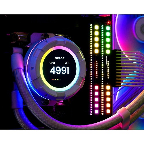 Яркий 2,1-дюймовый LCD-дисплей позволяет легко персонализировать устройство, загружая собственные GIF- или MP4-анимации с помощью интуитивно понятного программного обеспечения. Фирменный софт SPACE отличается простотой и информативностью: загрузка контента происходит в один шаг, а встроенная база считывания BIOS предоставляет доступ к данным процессора, видеокарты и 4-pin разъемов без необходимости разбираться в сложных настройках BIOS. Это делает управление системой наглядным, удобным и полностью адаптированным под пользователя.