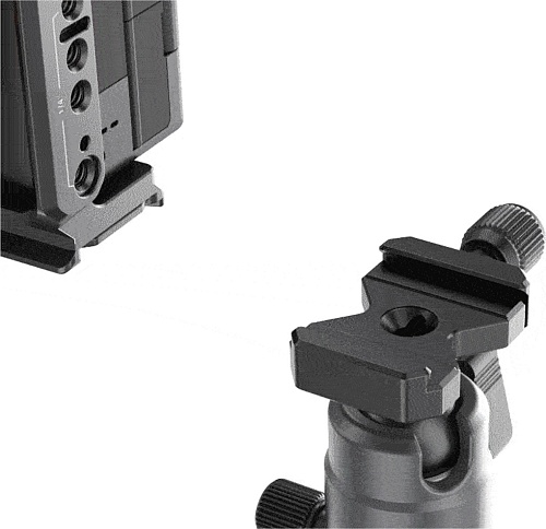 Камера надежно фиксируется с помощью одного винта 1/4"-20 внизу и отверстия для плечевого ремня с левой стороны. Это позволяет вам быстро и легко снять и установить камеру для разных сценариев съемки. Быстросъемная пластина Arca внизу клетки дает вам возможность быстро переключаться между съемкой с штатива, электронного стедикама и съемки с рук.