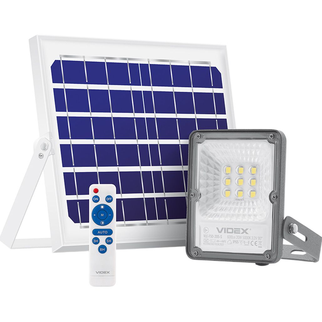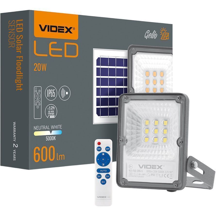 Прожектор Videx оснащен пультом дистанционного управления, с помощью которого можно легко включать и выключать устройство, а также регулировать яркость и выбирать нужный режим работы. В режиме AUTO прожектор автоматически меняет яркость в зависимости от времени работы: с 100% яркости в первый час до 30% с восьмого часа и до выключения. Прожектор также поддерживает два режима с датчиком движения. В режиме A устройство реагирует на движение с максимальной яркостью 100%, а в отсутствии движения — снижает яркость до 20%. В режиме B свет включается на 100% яркости при движении и выключается через минуту, если движение отсутствует.