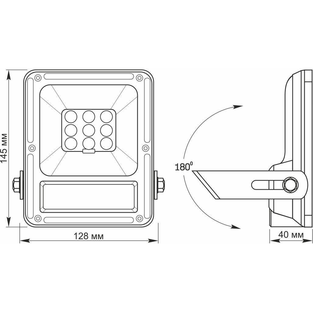 Корпус прожектора выполнен из алюминия, что обеспечивает его долговечность и устойчивость к механическим повреждениям. Прожектор защищен по стандарту IP65, что означает высокую степень защиты от влаги и пыли, позволяя использовать его в любых погодных условиях, в том числе на улице, при дожде или снегопаде. Рабочая температура устройства варьируется от -20 до +50 °C, что делает его пригодным для эксплуатации в широком диапазоне климатических условий.