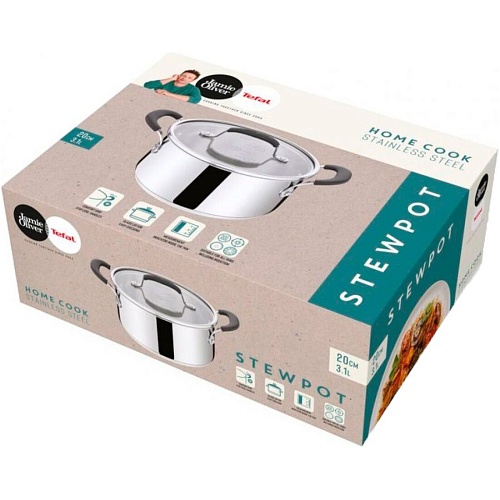 Кастрюля Tefal Jamie Oliver Home Cook E3184455 объемом 3,1 литра сочетает в себе стильный внешний вид и прочность. Изготовленная из нержавеющей стали, она не только устойчива к коррозии, но и придает кухне современный облик. Благодаря диаметру 20 см и вместительности, эта кастрюля идеально подходит для приготовления разнообразных блюд, от супов до рагу.