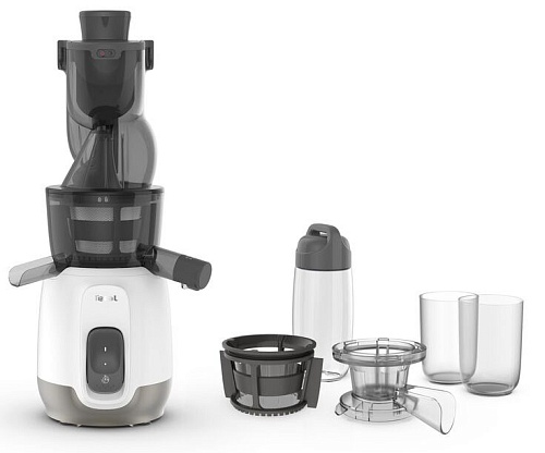 Комплектация | Соковыжималка/ Резервуар для сока/ Резервуар для мякоти/ Насадка для мороженого и сорбета/ Бутылочка/ Толкатель/ Щеточка для чистки/ Инструкция/ Гарантийный талон |