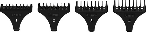 Комплектация | Триммер • документация • масло и щеточка • 4 насадки для стрижки 1.5, 3, 4.5 и 6 мм • адаптер питания 110 – 240 В |