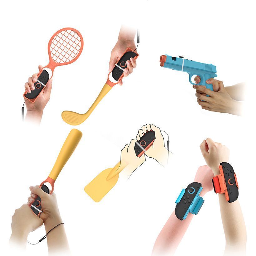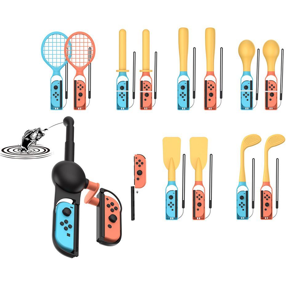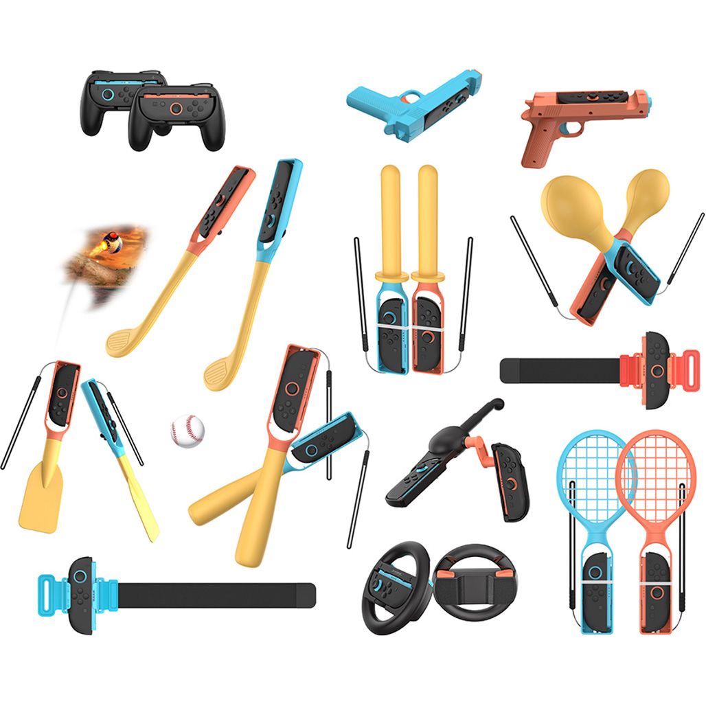 | Комплектация | Держатели для геймпадов: геймпад - 2 шт, руль - 2 шт, пистолет - 2 шт, клюшка - 2 шт, бита - 2 шт, весла - 2 шт, ракетка - 2 шт, повязка на ногу - 2 шт, повязка на руку - 2 шт, удочка - 2 шт, маракас - 2 шт, синай - 2 шт • чехол для хранения |