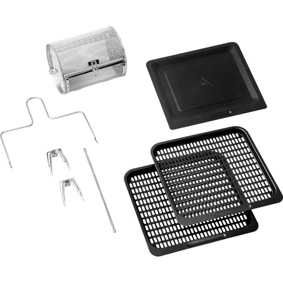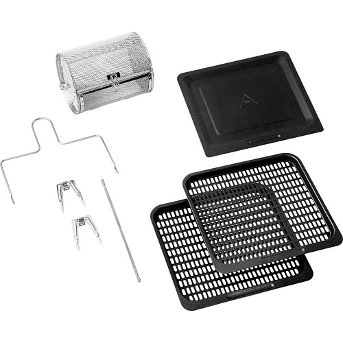 | Комплектация | Мультипечь • противень для выпечки 2 шт. • вращающаяся круглая корзина (2.9 л) • щипцы для вертеля • крючок для жарки 2 шт. • поддон для сбора жира • документация |