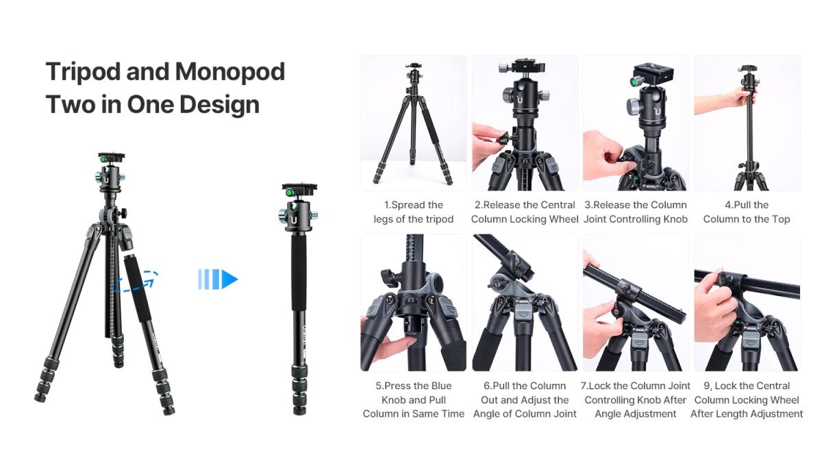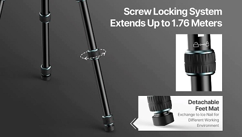 Штатив Ulanzi MT-59 также может быть трансформирован в монопод, предоставляя вам альтернативный способ съемки. Одна из ножек штатива может быстро разобрана и соединена с центральной колонной, давая вам гибкость и мобильность при съемке. Штатив оснащен компактной системой винтовой фиксации ножек, обеспечивающей быструю и надежную фиксацию. Кроме того, специально разработанная металлическая шаровая головка может вращаться на 360 градусов, позволяя вам настроить идеальный угол съемки для панорамных фотографий.