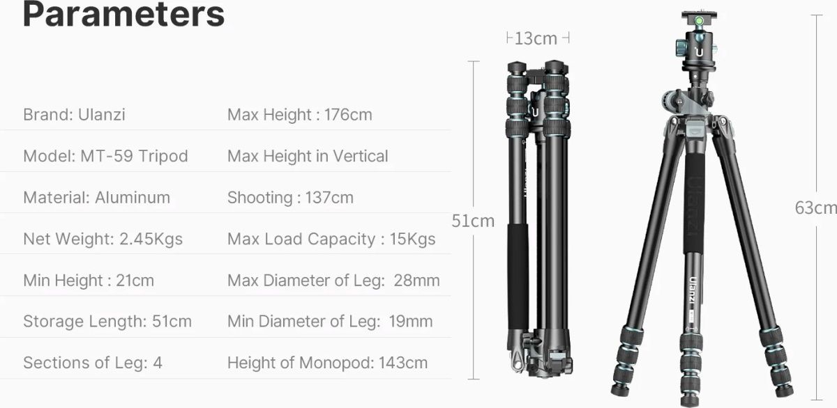 Штатив Ulanzi MT-59 выполнен из прочного алюминиевого сплава и имеет вес нетто 2,45 кг. Он состоит из 4 секций ножек и может достигать максимальной высоты 1760 мм. Максимальная высота в вертикальном положении составляет 1370 мм, а минимальная высота всего 210 мм. Диаметр ножек варьируется от 19 до 28 мм. Штатив также может использоваться в качестве монопода, достигая высоты 1430 мм. В комплект входит штатив с центральной шаровой головкой и быстросъемной пластиной Arca. Улучшите свои фотографии с помощью профессионального штатива Ulanzi MT-59. Приобретайте его сегодня и откройте новые горизонты в мире фотографии.