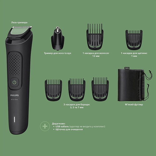 | Комплектация | Триммер • насадка для носа и ушей • насадка для волос 12 мм • насадка для щетины 1 мм • насадка для бороды (3-7 мм) 3 шт. • мягкий футляр • кабель для зарядки • щеточка для очистки • документация |