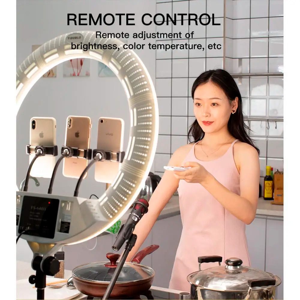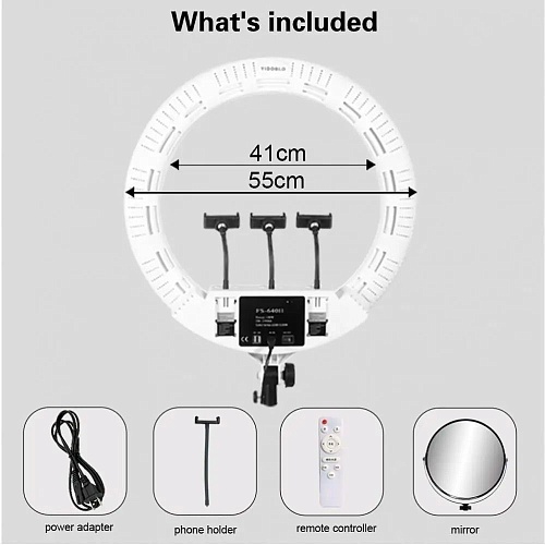 | Комплектация | Кольцевая лампа • адаптер питания • держатель для телефона 3 шт • пульт ДУ • зеркало • сумка для переноса • документация |