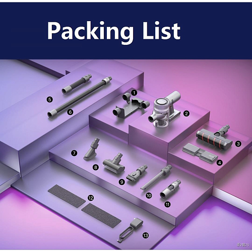 Комплектация | Пылесос • основная электрощетка • мини-электрощетка • удлинительная трубка • гофрированная трубка • коннектор • мягкая щетка для пыли • насадка "2в1" • щелевая насадка • настенный держатель для зарядки • адаптер питания |
