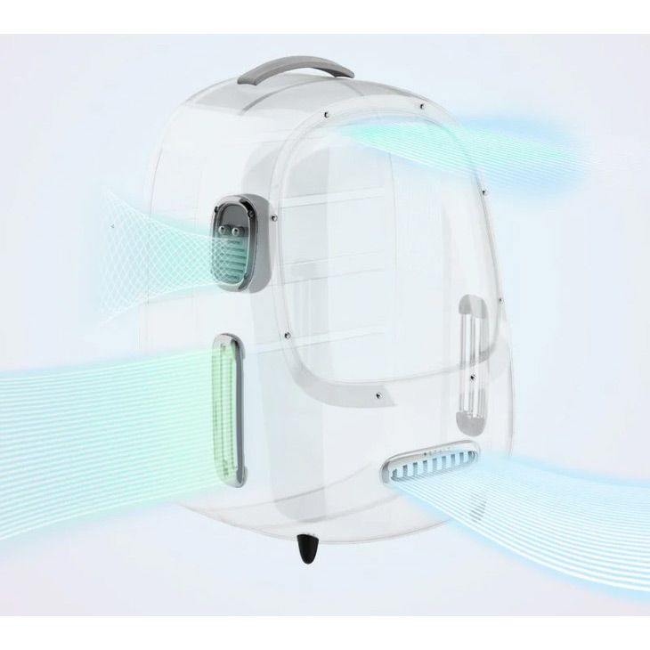 Сетчатое отверстие и интеллектуальная система вентиляции обеспечивают отличную циркуляцию воздуха внутри рюкзака. Встроенный "мини-вентилятор" мощностью 5 В, способствует активной подаче воздуха, циклическую вентиляцию для вашей кошки или собаки, чтобы им не было душно дышать в рюкзаке.