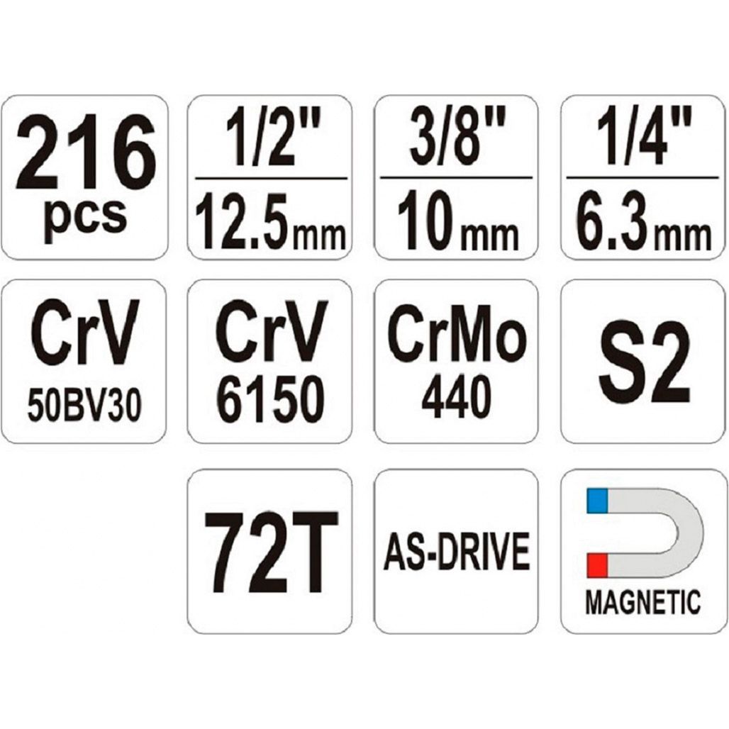 - Трещотки: 1/2": 255мм, 3/8": 200мм, 1/4": 155мм на 72 зуба
